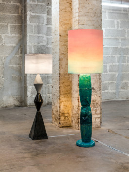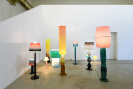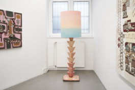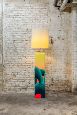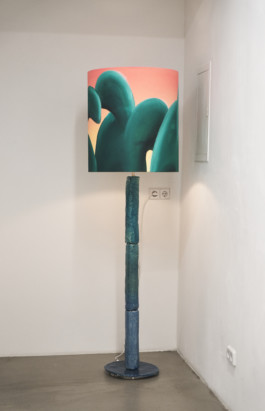 In ihrer Werkserie von Stehlampen nimmt sich Tönnissen dem Motiv von Sonnenuntergängen an. Die Wirkung der einmaligen Naturschauspiele bannt sie in changierende Farbverläufen auf den Bildträger der Lampenschirmen, während die Lampenständer mit Keramik ummantelt sind und das ineinanderfließen der Farben noch gesteigert wird. Die Lampe selbst fungiert als Mittel zum Zweck, die abstrahierten Horizonte zum Leuchten zu bringen. So steckt nicht nur in der Funktion und dem Motiv des Sonnenuntergangs selbst ein gewisser Grad an Kitsch, sondern auch in der Tatsache, dass Farbverläufe an sich, Gegenstand größter Beliebtheit in der visuellen Bildsprache geworden sind und mittlerweile sich nahezu überall im Alltag wiederfinden. Ein Blick auf das eigene Handy und dessen Apps verraten allzu schnell diesen ausgedienten Design-Trend. Die Sunset und Sunrise Bench sind wiederum Sitzbänken von Stränden nachempfunden, die zu dem Beobachten eben jener Phänomene einladen sollen. So im Raum stehend, wirken sie wie ein Versprechen, die südländischen Abenddämmerungen nach Hause ins eigene Heim zu holen und verliebt, die Hände haltend, gemeinsam das Ereignis genießen zu können. Doch freilich, reproduzieren die Werke nur ein Echo, von dem was war.