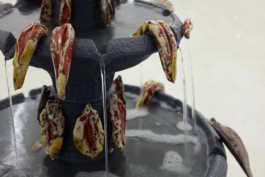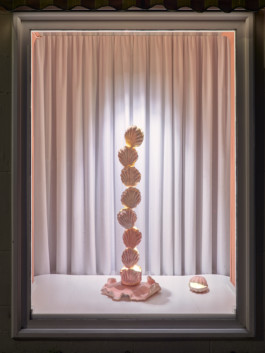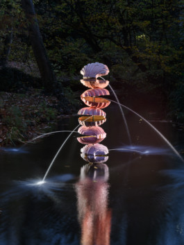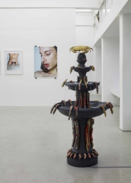 In diesem Zusammenhang zeigt sich, dass Tönnissen häufig bewusst die Nähe zu Design herstellt, indem die Objekte ‘nutzbar’ gemacht werden. Als Lampe, Sitzbank oder als kleine Brunnenskulptur, die unter anderem an Trinkstellen im öffentlich Raum angelehnt sind. Titelgebend nimmt so das Motiv des Brunnens eine zentrale Position in der Ausstellung ein, bei denen sich Tönnissen unter anderen von venezianischen Zisternen hat inspirieren lassen. Mit Brunnen fest verankert, ist das Bild der Muschel als Sinnbild der Weiblichkeit und damit der Venus. In Anspielung auf Botticellis “Die Geburt der Venus”, die trotz ihrer reizenden Nacktheit eher die geistige als körperliche Liebe symbolisieren soll, findet sich in eine Bronze gegossene Nachbildung einer Sandkasten-Muschel, die wiederum als Platzhalter einer Brunnenskulptur dient. Die Bronze steht hier im direkten Kontrast zu der Keramik, die keine Zufälle zulässt. Doch durch die Bearbeitung der Oberfläche beim Abguss, spielt Tönnissen mit dem Moment des Imperfekten, den sie auch in der Verwendung der Keramik provozierend herausgearbeitet.
